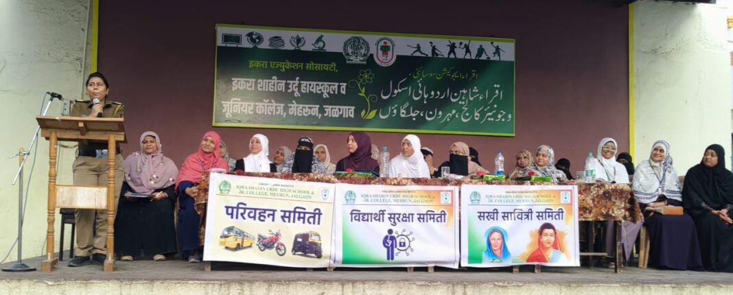 जळगाव: दिनांक 16.12. 2025 इकरा शाहीन उर्दू हायस्कूल व ज्युनिअर कॉलेज येथे सखी सावित्री समिती, महिला सुरक्षा समिती, विद्यार्थी सुरक्षा समिती तसेच परिवहन समिती यांची एकत्रित व महत्त्वपूर्ण बैठक उत्साहात पार पडली. विद्यार्थ्यांचे सर्वांगीण कल्याण, सुरक्षितता, आरोग्यविषयक जाणीव तसेच शाळा-परिसरातील सुरक्षित वातावरण निर्माण करणे या उद्देशाने या बैठकीचे आयोजन करण्यात आले होते. कार्यक्रमाची सुरुवात मुबशशीरा मुबीन शेख यांच्या कुराण पाठाने झाली.या संयुक्त बैठकीला वैद्यकीय क्षेत्रातील तज्ज्ञ डॉ. मिदहत फातेमा शेख हारून, नामांकित फिटनेस एक्सपर्ट निगार शाह तसेच पोलीस दलाच्या वतीने सय्यद निलोफर यांनी उपस्थित राहून मार्गदर्शन केले. डॉ. मिदहत फातिमा यांनी विद्यार्थिनींच्या आरोग्यविषयक समस्या, किशोरवयीन मुलींची विशेष काळजी, स्वच्छता, पोषण आहार, मानसिक आरोग्य व वैद्यकीय तपासणीचे महत्त्व यावर सविस्तर मार्गदर्शन केले. त्यांनी वेळेवर उपचार, आरोग्याबाबत लाज किंवा भीती न बाळगता योग्य व्यक्तींशी संवाद साधण्याचा सल्ला दिला.
