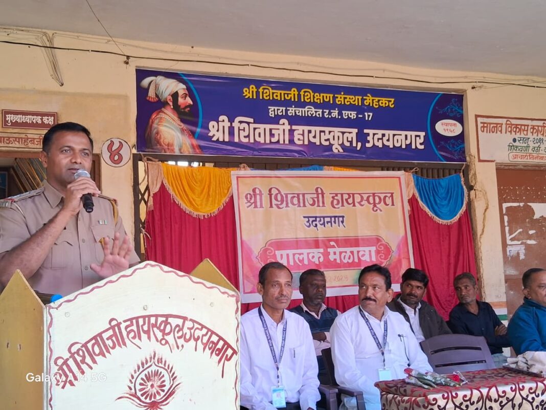 उदयनगर : येथील श्री शिवाजी हायस्कूलमध्ये शनिवार, दि. १३ डिसेंबर रोजी पालक मेळाव्याचे आयोजन करण्यात आले होते. या मेळाव्यास अमडापूर पोलीस स्टेशनचे ठाणेदार निखील निर्मळ हे प्रमुख पाहुणे म्हणून उपस्थित होते. तर कार्यक्रमाच्या अध्यक्षस्थानी विद्यालयाचे मुख्याध्यापक मा. एन. ए. बोडखे होते. यावेळी मोठ्या संख्येने पालकवर्ग उपस्थित होता.